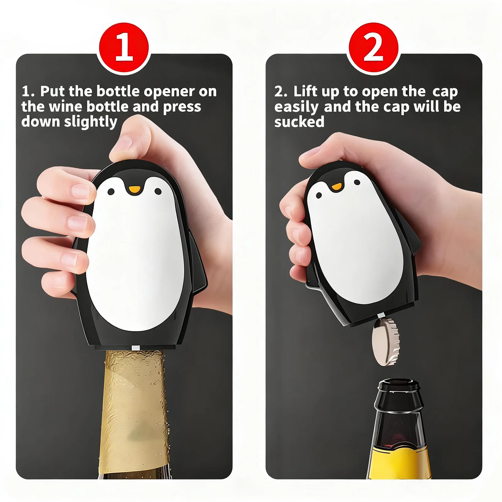 - Automatic Push Down Off Mechanism: Simply place the penguin-shaped opener over the bottle cap, press down, and lift to effortlessly open your beer or in just one second. No more struggling with stubborn caps!